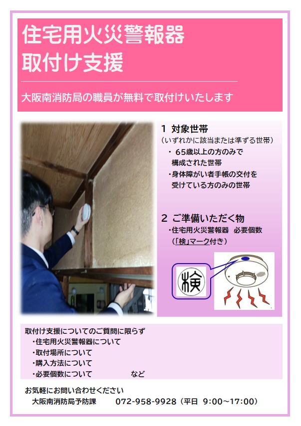 住宅用火災警報器の取付け支援について 更新日:2025年10月17日 住宅用火災警報器を自分で取り付けることが難しいとお感じの高齢者世帯などを対象に、消防職員が設置のお手伝いをする制度です。 この記事に関するお問い合わせ先 大阪南消防局 警防部 予防課〒583-0015大阪府藤井寺市青山3丁目613番地の8電話番号:072-958-9928メールフォームによるお問い合わせ