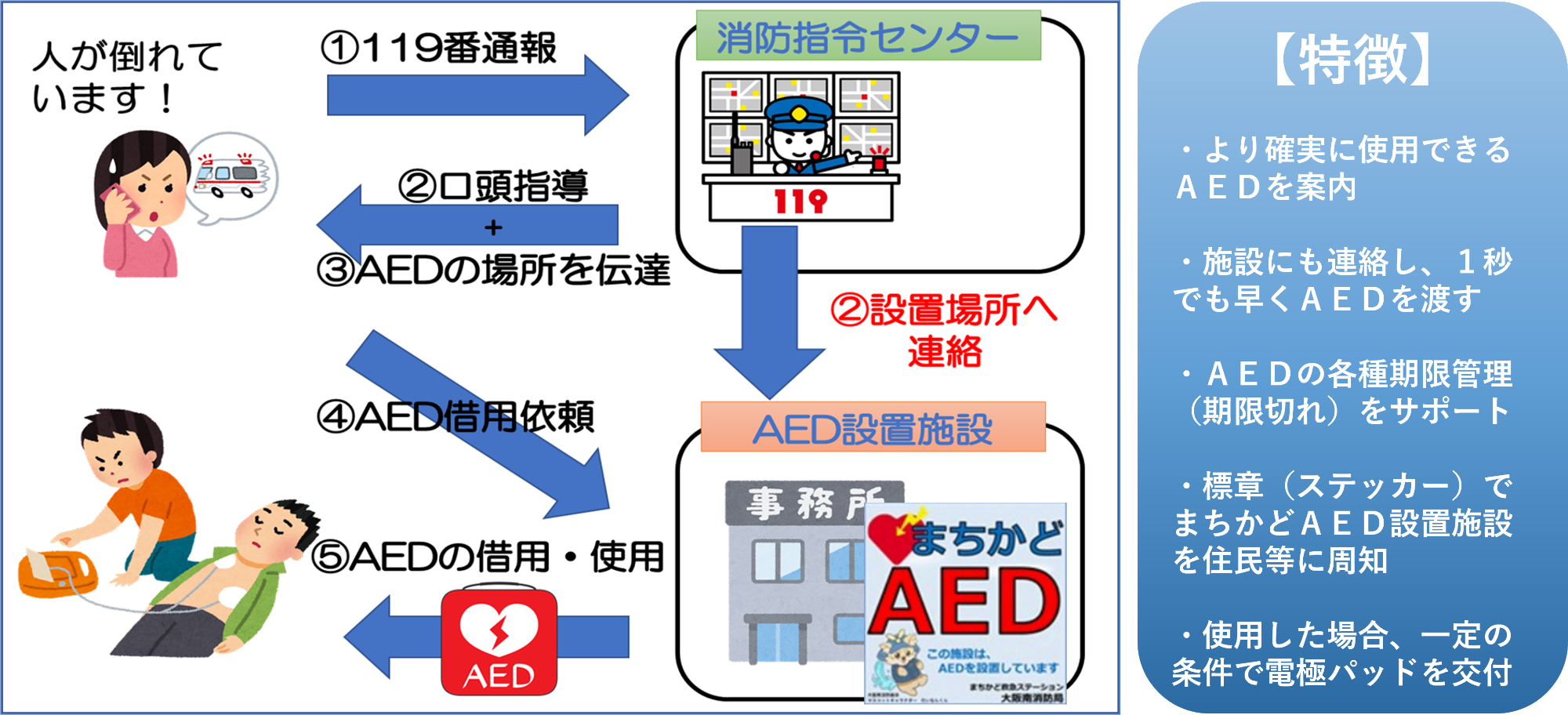 事業所等に設置されているAEDを消防に登録していただき、人が倒れた場合、消防指令センターが近くのAEDを確認、通報者に情報提供かつ設置場所に連絡を行い、AEDの活用と救命を促進する事業です。